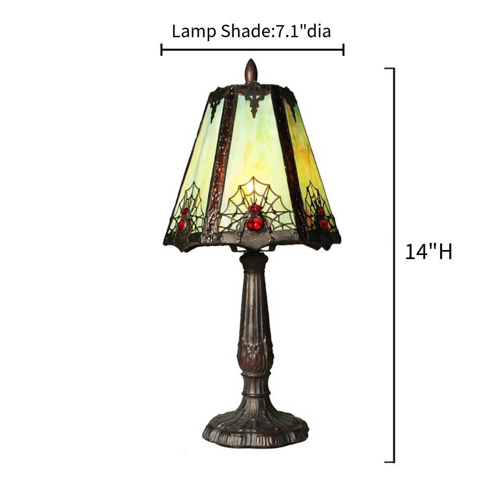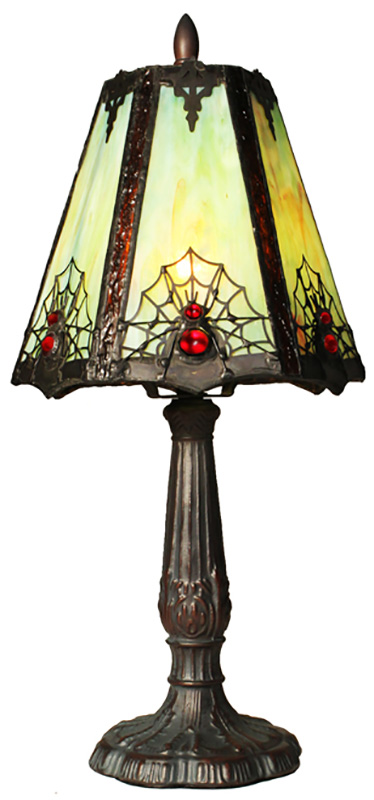Hand made in the true tiffany method - foiled and soldered. The shade contains a spider web design with green, yellow, & amber colors.