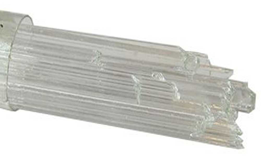 Noodle: Thin glass strip similar to the look of a fettuccini noodle. C.O.E.: 96. Color: Clear Icicle (02) (number in parentheses is base glass). Size: 17"L x 3/16"(4.5mm) Thick. Package: 20 - 30 noodles per 5 Oz. tube. Manufacturer: Oceanside